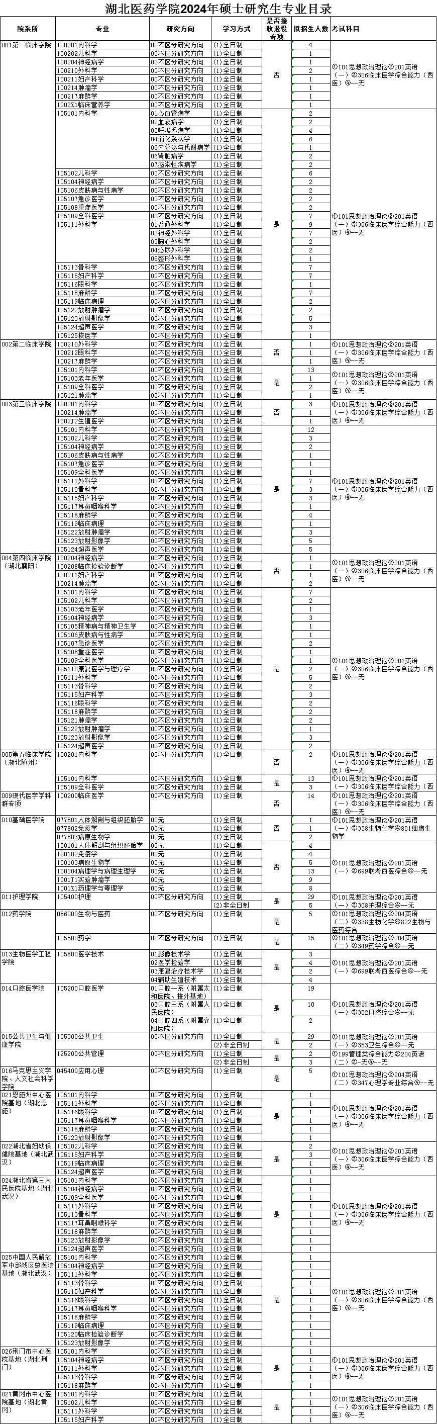 湖北医药学院2024年硕士研究生专业目录