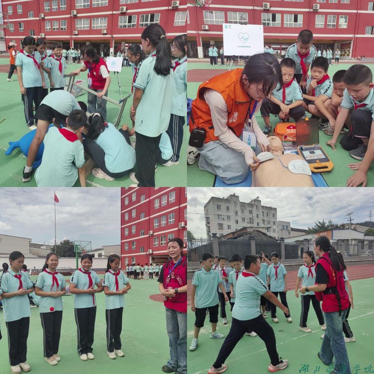 活动过程中,志愿者们以生动有趣的方式向孩子们传授安全急救技能。在讲解AED时,志愿者们利用模拟设备,让孩子们亲手操作,感受急救设备的重要性;在演示海姆立克急救法时,他们通过情景模拟,让孩子们了解在紧急情况下如何自救互救;而在教授单双结绳时,志愿者们则耐心细致地指导孩子们如何打结,确保他们在遇到危险时能够迅速逃生。孩子们更是争先恐后地举手报名,积极参与互动,他们或蹲或坐,围成一圈,认真听取志愿者的指导,然后亲自动手尝试。每当有孩子成功完成一个技能时,现场就会爆发出热烈的掌声和欢呼声,气氛热烈而欢乐。