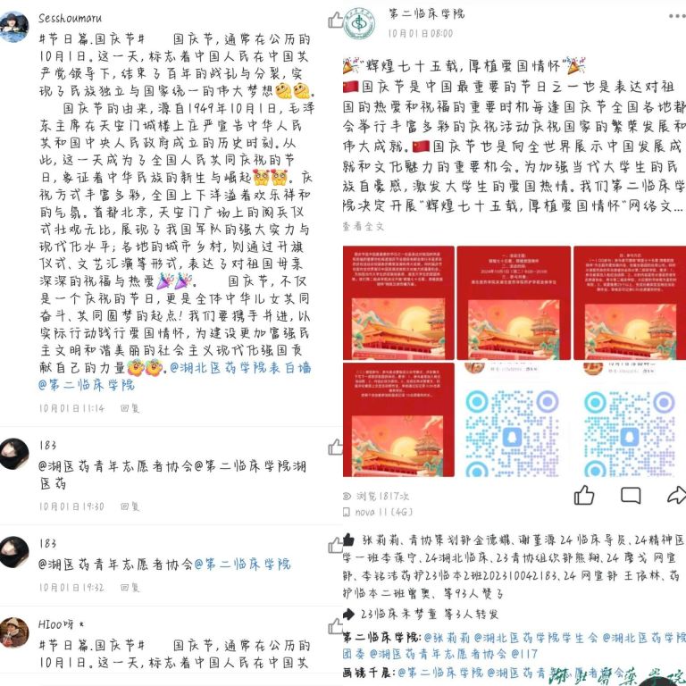 本网讯(通讯员 董静雯)为加强当代大学生的民族自豪感,激发大学生的爱国热情。第二临床学院于10月11日开展"辉煌七十五载,厚植爱国情怀"网络文明传播活动。