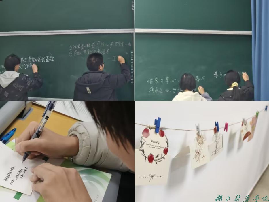在热闹的感恩小游戏环节,在现场的同学们之中随机挑选出四位“幸运嘉宾”在黑板上写下关于感恩的名人名言或者是诗句,以此来分享同学们对感恩的理解和感悟。用卡片记录的拿份感激,被挂上感恩墙,永葆内心的那份知恩之心,同学们积极参与其中,现场气氛格外热闹。最后,由团支书侯紫康进行活动总结。