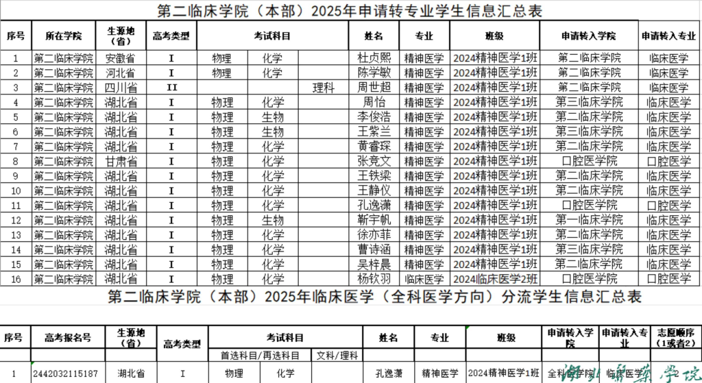根据《关于启动2025年转专业及全科分流工作的通知》要求,经个人申请,班级辅导员审核,学院同意,现将拟申请转出学生基本情况公示如下: