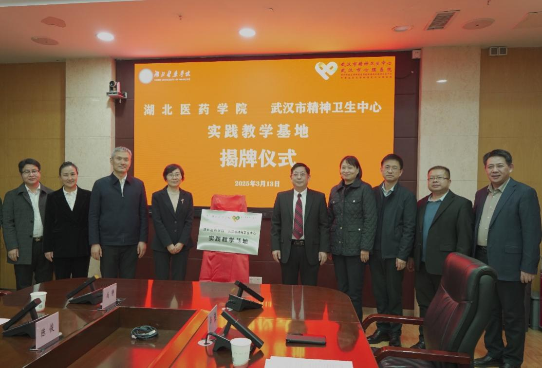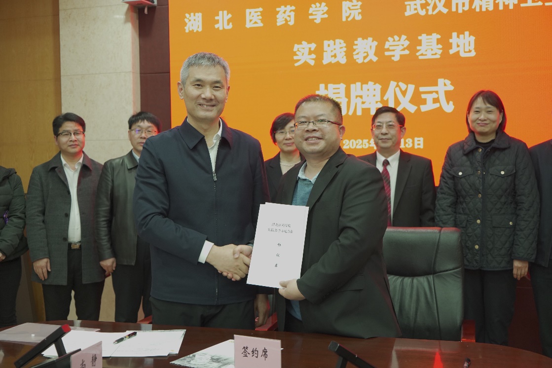 罗杰代表学校与武汉市精神卫生中心签署实践教学合作协议。在全体嘉宾的见证下,郑丹凤与彭厚鹏共同为“湖北医药学院、武汉市精神卫生中心实践教学基地”揭牌。