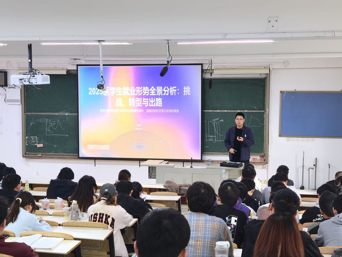 讲座中,郝老师以“百万医学生求职大潮下的行业变革”为核心切入点,结合最新就业市场供需数据与医疗行业政策导向,深入剖析当前医学生面临的就业挑战。同时,他紧扣 “医疗数字化转型”“基层医疗服务升级”等行业前沿趋势,详细解读职业转型的潜在方向,引导同学们在激烈竞争中找准自身定位,提前规划职业发展路径。