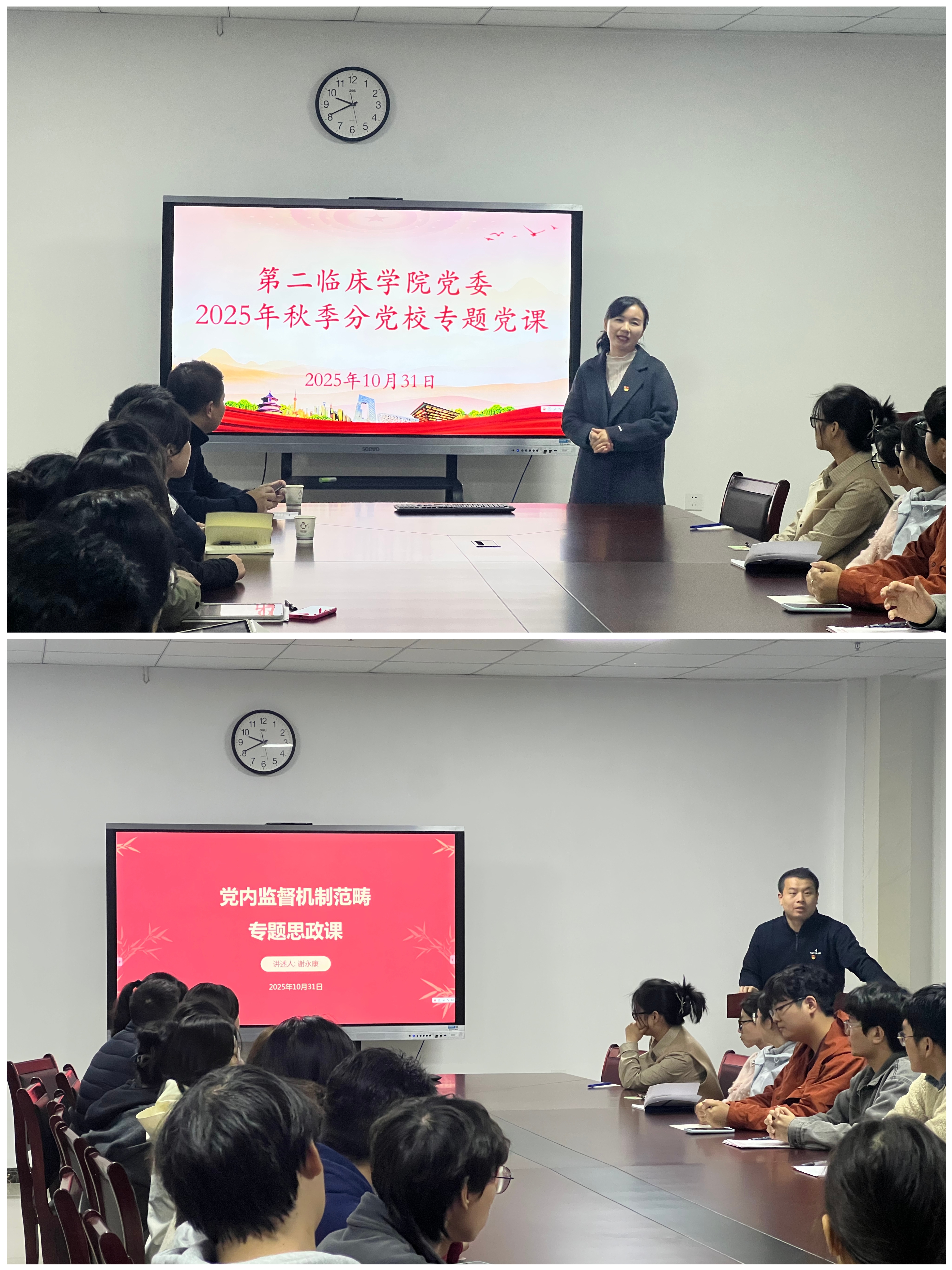 本网讯(通讯员:李占秋)10月31日晚,第二临床学院党委于东风校区成功举办2025年秋季分党校专题党课。本次党课特邀国药东风总医院纪委副书记谢永康担任主讲,以《党内监督机制范畴》为题,为全体培训学员带来了一场内容翔实、意义深刻的专题讲座。第二临床学院党委副书记陈立、各支部书记和全体参训学员参加此次党课。