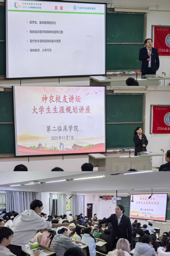 本网讯(通讯员 张莉莉)为帮助精神医学专业学子明确职业方向、缓解成长困惑,第二临床学院11月7日在8503教室开展“神农校友讲坛”暨大学生生涯规划讲座。本次讲座面向24、25级精神医学班180余名学生,围绕医学生成长与职业发展展开深度分享,为青春逐梦的医学生们送上了一堂干货满满的生涯指导课。第二临床学院党委副书记陈立主持活动、精神医学班辅导员老师参加活动。