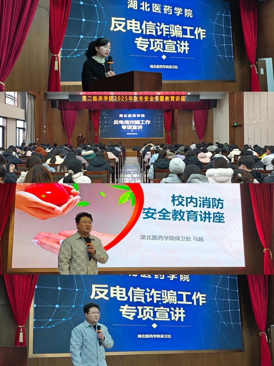本网讯(通讯员:潘威霖)为切实提升师生安全防范意识,筑牢校园安全防线,11月28日下午,湖北医药学院第二临床学院邀请保卫处马越老师在国药东风总医院科教大楼报告厅举办反电信诈骗专项及校内消防安全主题宣讲活动。第二临床学院党委副书记陈立、辅导员代表及200余名学生参与活动。