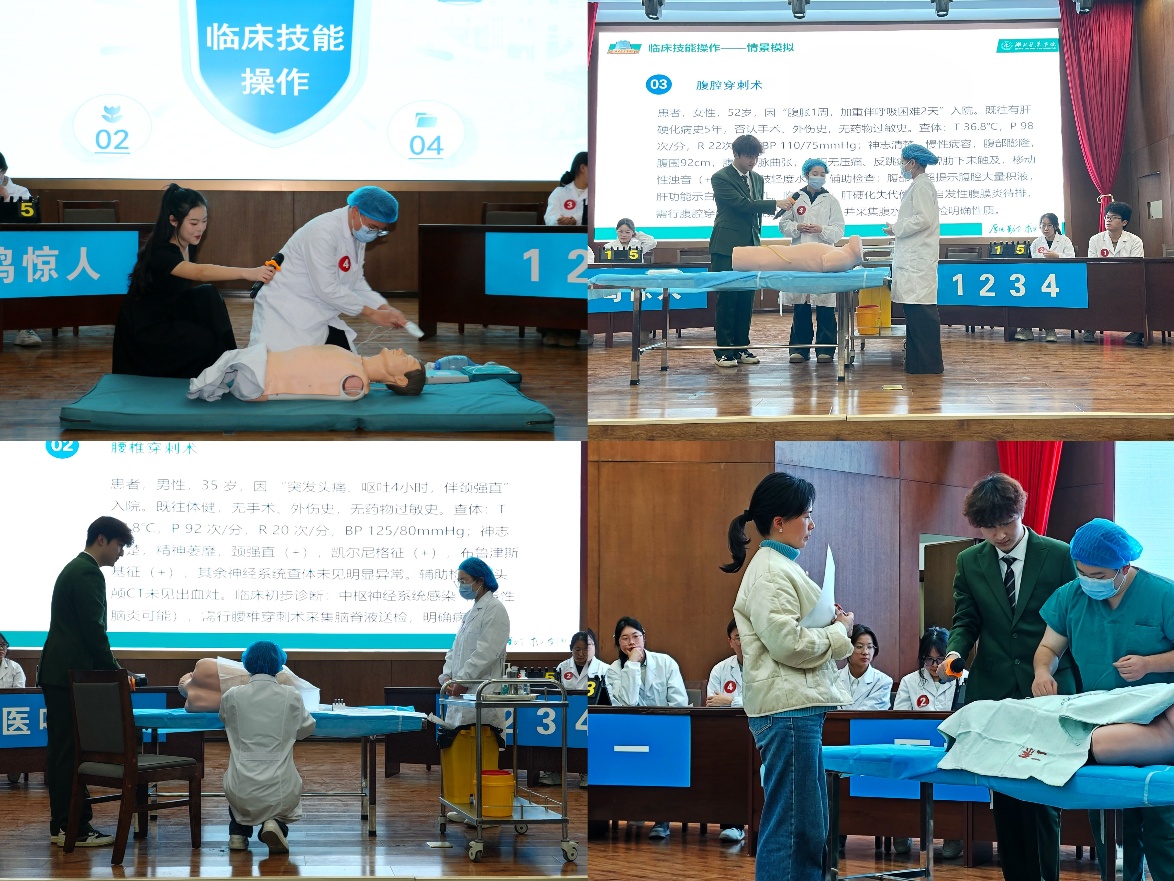 本次竞赛聚焦临床核心知识与技能,设置“知识问答+技能操作”两大模块。理论考核围绕基础医学、诊断学、内科学、外科学、妇产科学、儿科学等核心课程以及部分基础常识题,采用基础知识问答、案例分析题型,重点考察选手对疾病诊断、治疗方案制定的临床思维能力;技能操作环节则模拟真实临床场景,涵盖“心肺复苏”“外科手术无菌操作”“腰部穿刺”“腹腔穿刺”四项关键技能,从操作规范性、流程完整性、应急处理能力等维度进行量化评分,确保竞赛的专业性与公平性。