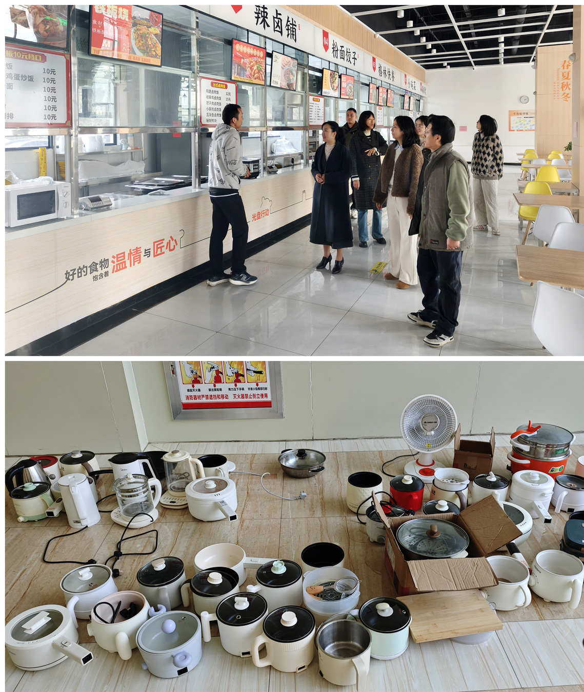 检查中发现,部分寝室存在插板未固定、手机充电线未拔、纸箱等易燃物品堆积等隐患,检查组当场登记违规物品,对多件热得快、电煮锅、空气炸锅等违规电器予以收缴,现场整改通道堵塞、插板乱放等隐患问题。