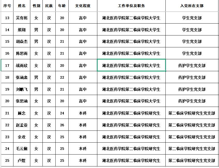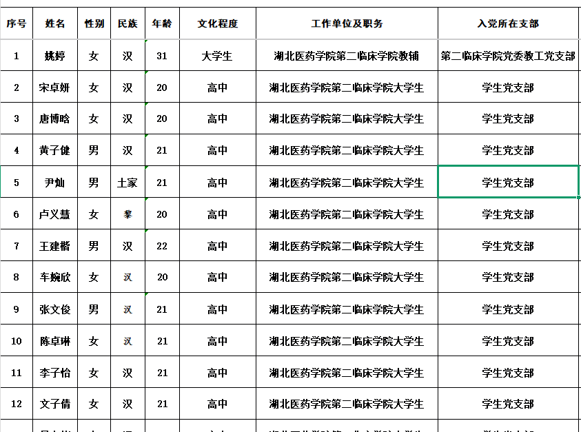 根据《中国共产党发展党员工作细则》,严格按照发展党员各项程序,经学生党支部审查和学院党委预审,拟发展姚婷等25名同志为中共预备党员。为加强对发展党员工作的民主监督,增强工作透明度,按照学校党委发展党员工作制度有关规定,现公示如下: