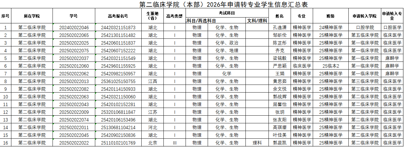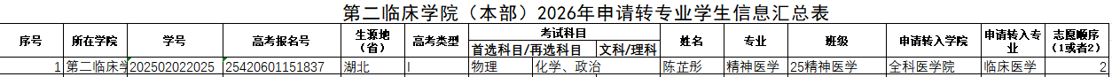 根据《关于启动2026年转专业及全科分流工作的通知》要求,经个人申请,班级辅导员审核,学院同意,现将拟申请转出学生基本情况公示如下: